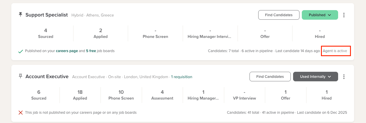 However, for agentic jobs created before upgrading, existing candidates will not be rescored, and no automated Agent actions will run for them. The Agent will only evaluate and take actions on new candidates moving forward.