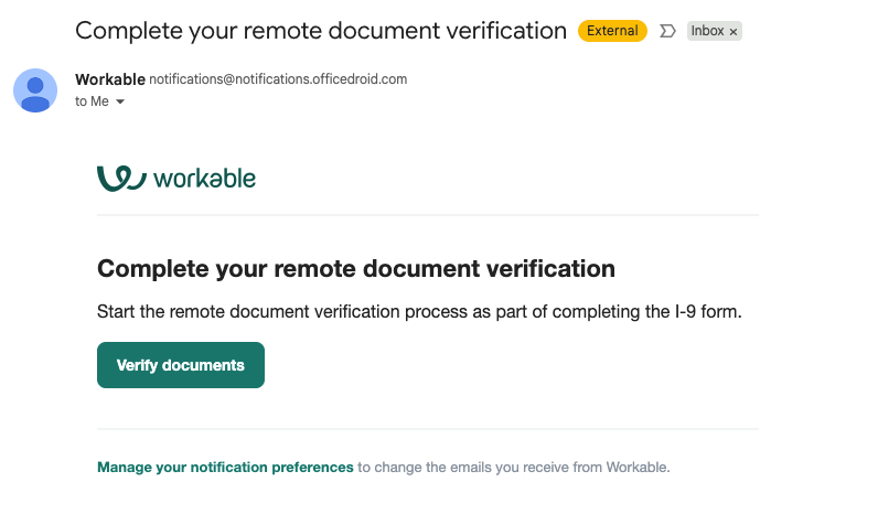 If you have access to Workable, you will receive an Inbox entry, a to-do item, and an email/Slack notification to complete remote verification.