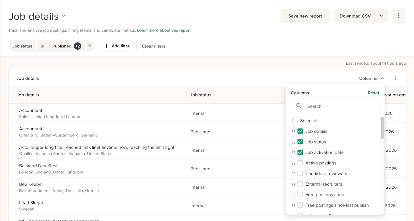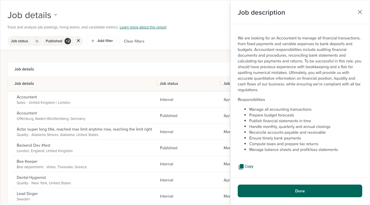 The Job details report gives recruiting teams and admins a single place to view, filter, and export structured data about every job in the account.