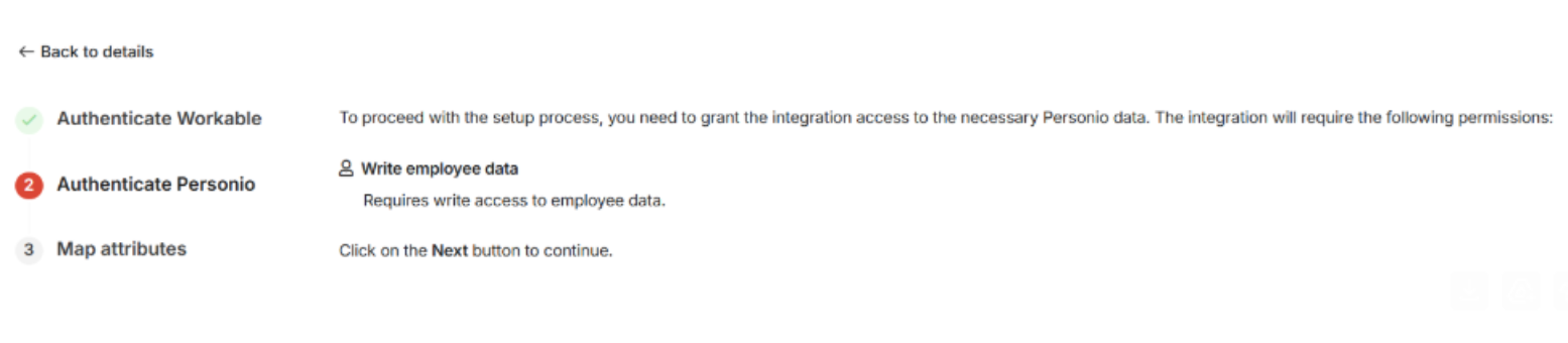 Step two of the configuration wizard requires you to grant the Workable integration access to the necessary Personio data. Follow these steps: