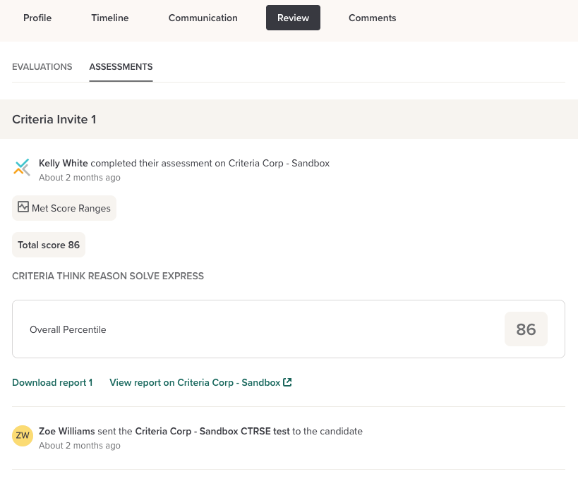 If your report format is PDF, the Download report 1 link will also be shown. This will open in a new tab, and it is a copy of the Criteria PDF report that was saved in Workable when the results were posted. This is a static PDF that will not change if something changes within Criteria.